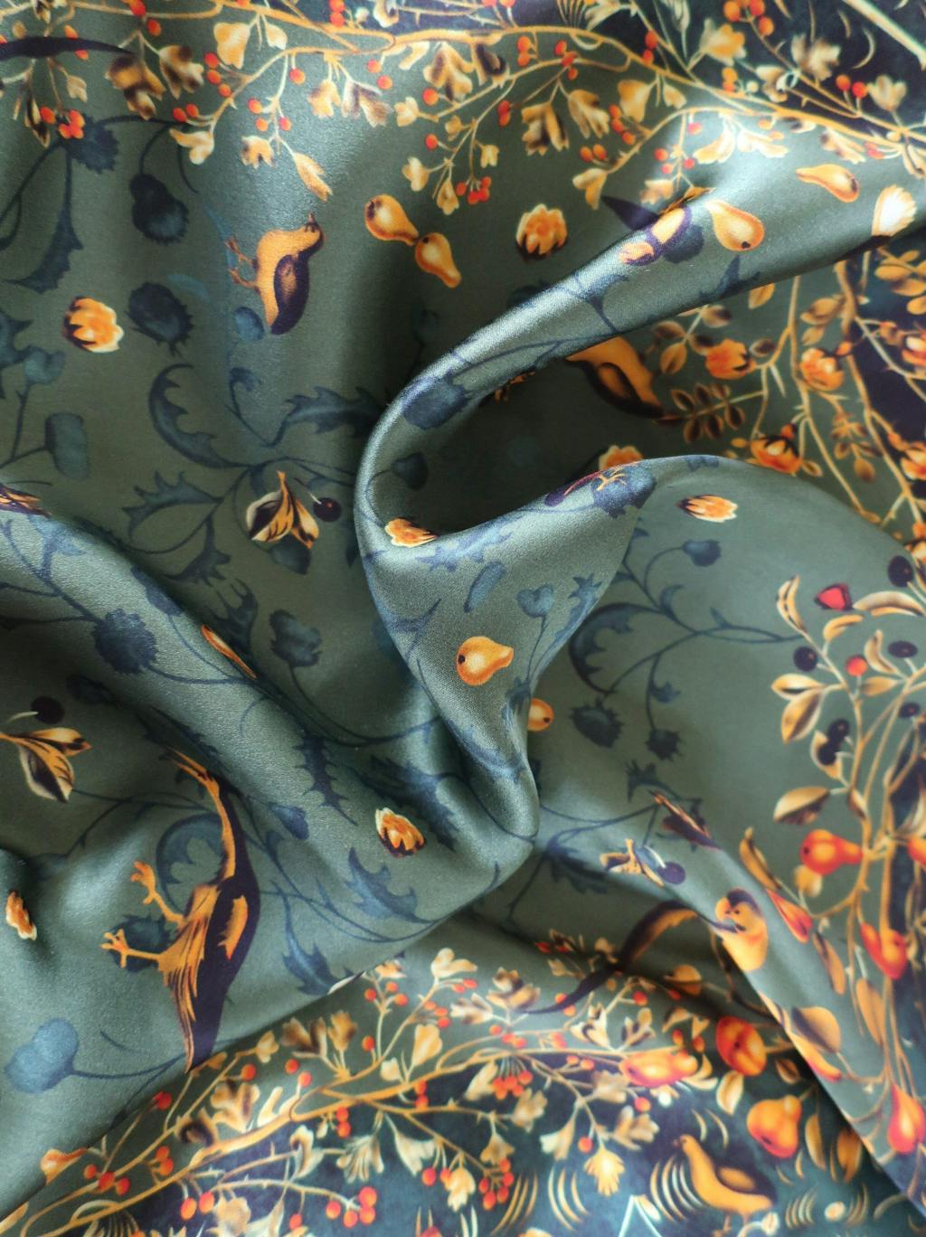 Natural Mulberry Silk Scarf – Green Floral Bird Pattern Design – 53x53 cm